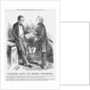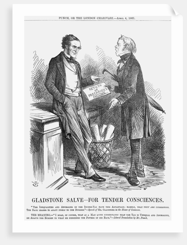 'Gladstone Salve - For Tender Consciences', 1863. Mr Gladstone's 1863 Budget began with the premise that there was a surplus of £3,741,000. Various small increases in duties would bring that to a total of £3,874,000. But then, a number of reductions in duties and income tax (down from 9d to 7d in the pound) would diminish the return and the surplus would dwindle by £3,343,000. Here, Mr Punch translates Mr Gladstone's 'political language' to show that nothing much is being given back to the public, and that the Budget was carefully calculated to squeeze as much from the tax payers as it was thought they could bear. This cartoon may also refer to the Budget proposal - later abandoned - to tax the income of charities. From Punch, or the London Charivari, April 4, 1863.