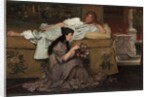 Glaucus and Nydia, 1867. "It was one of the few moments in her brief and troubled life that it was sweet to treasure." Weaving a rose garland as a present for her beloved master Glaucus, the blind servant Nydia resists speaking of her love for him. The scene is based on Sir Edward Bulwer-Lytton's enormously popular historical novel The Last Days of Pompeii (published in 1835), a melodramatic epic set in ancient Roman times, which culminates with the eruption of Mount Vesuvius. Responding to the 19th-century appetite for things antique, the artist filled his historical scenes with depictions of Roman frescoes and statuary. Dutch by birth, Alma-Tadema made this picture in Brussels for a London art dealer. But the demand for such paintings became so great that he moved to England, where he achieved great financial and social success.