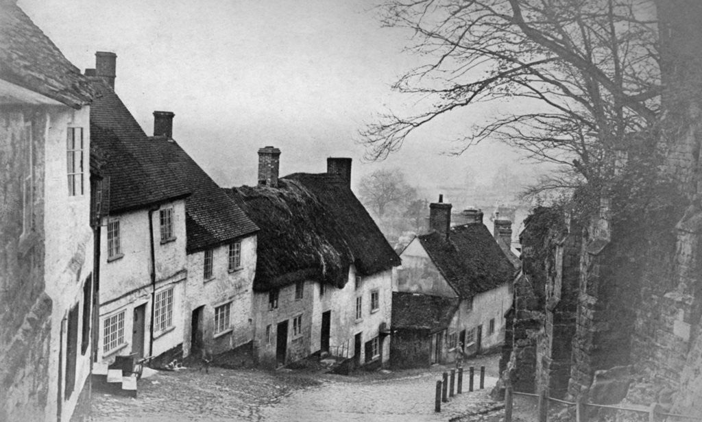 Gold Hill, Shaftesbury, Dorset, 1924-1926. The famous steep cobbled street in Shaftesbury immortalised in Hovis adverts. It was also used for a scene in the film version of Thomas Hardy's Far From the Madding Crowd. A print from Hutchinson's Britain Beautiful, edited by Walter Hutchinson, volume II, 1924-1926.