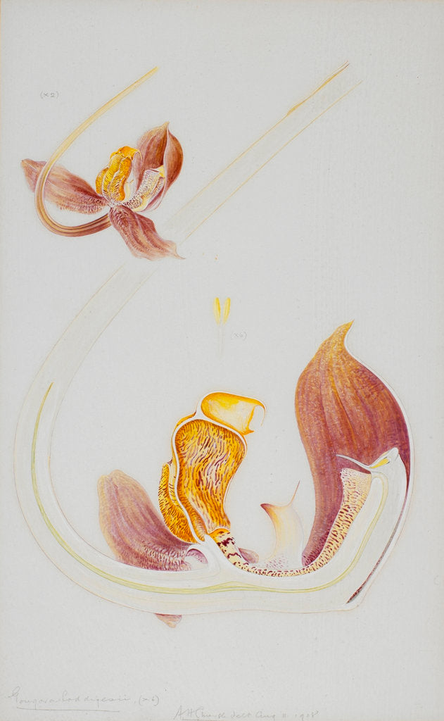 Botanical studies of flowers of a Gongora orchid native to Central and South America: here styled Gongora loddigesii, possibly Gongora galeata. The upper figure shows surface detail at x2 magnification, the lower figure a section through the flower at x6 magnification. There is a small detail of anthers also at x6 magnification Inscribed below in pencil: 'Gongora Loddigensii (x6) A.H.Church delt. Aug. 11 1908.' Arthur Harry Church was elected a Fellow of the Royal Society in 1921.