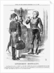 'Government Hospitality', 1867. Lord Derby reads the card presented at the doors of the Palace by Egypt. This relates to a visit made to Britain by the Viceroy of Egypt in July 1867. However, there was much indignation at the way the Government proposed to receive this friend of Britain. Eventually, it was agreed that a special train should be arranged, as should a guard of honour. The Government had actually arranged for the Viceroy to stay, at Britain's expense, in a public house. Outrage was expressed and eventually Lord Dudley offered the use of his house for the length of the Viceroy's visit. From Punch, or the London Charivari, July 13, 1867.