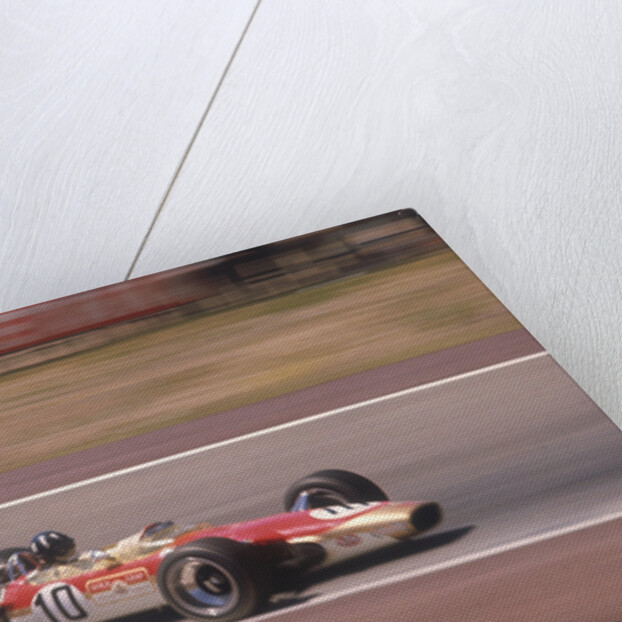 Graham Hill's Lotus at speed, Spanish Grand Prix, Jarama, Madrid, 1968. Hill won the race, the first of three victories in his second World Championship-winning season. Graham Hill was one of the first Formula 1 drivers to become a television personality as well as a racing star. He made his debut at Monaco in 1958 and went on to win 14 Grands Prix, and was World Champion in 1962 and 1968. He joined Jim Clark at Team Lotus in 1967, and in 1969 won his last Grand Prix - his fifth triumph at Monaco. He broke both legs when he was flung from his car in the United States Grand Prix, and was killed in a plane crash in 1975 with five other members of his Embassy Hill team.