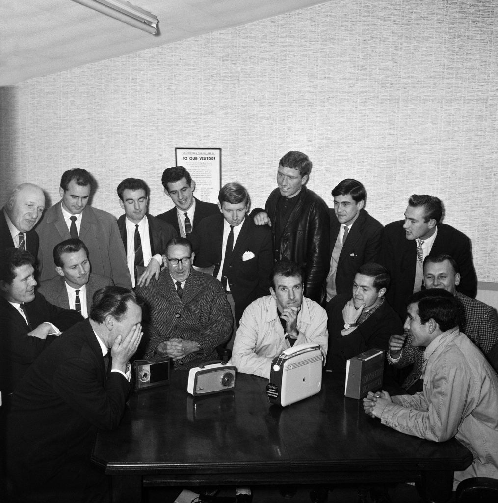Footballer players of non league Gravesend and Northfleet listen to the draw for the FA Cup third round. They were drawn away at Carlisle United. 26th November 1962.