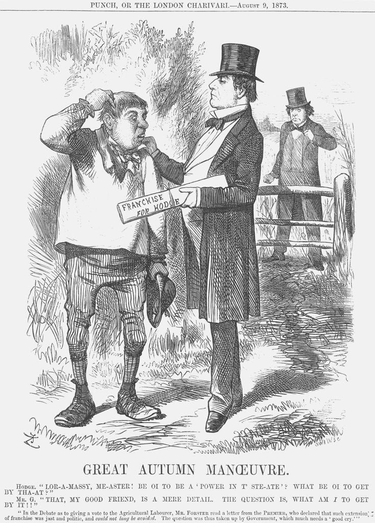 'Great Autumn Manoeuvre', 1873. Watched by a baleful Disraeli, Leader of the Conservative opposition, the Liberal Prime Minister, Gladstone, hands a puzzled yokel his franchise. This relates to the bill proposing the franchise for agricultural workers proposed by Sir Charles Trevelyan in July 1873. From Punch, or the London Charivari, August 9, 1873.