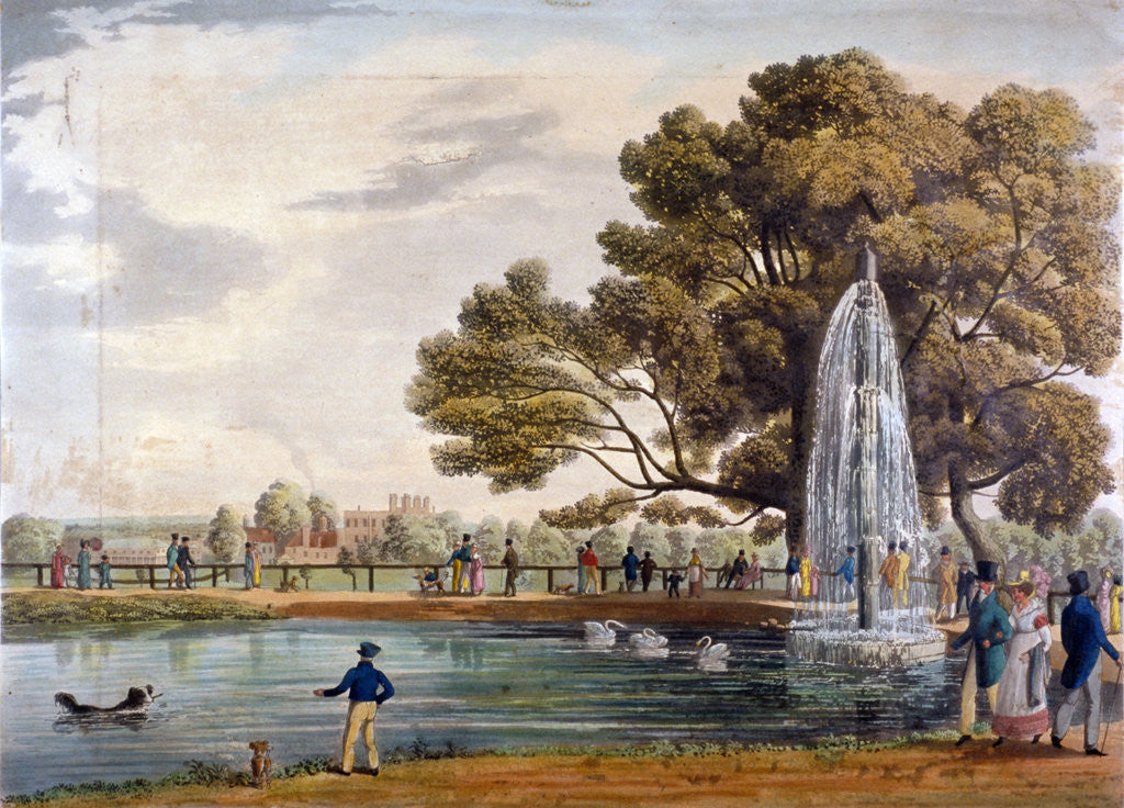 Green Park, Westminster, London, 1826. View with figures strolling around the reservoir and a dog in the reservoir retrieving a stick.