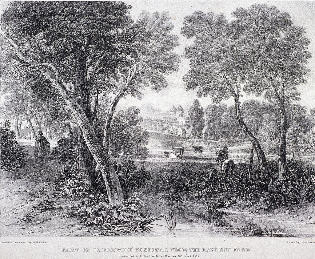Greenwich Hospital, Greenwich, London, 1822; view of part of Greenwich Hospital from the Ravensbourne.