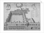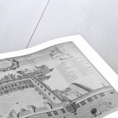 Gresham College, City of London, 1740. Bird's-eye view of Gresham College, looking east, showing the entrance in Old Broad Street; with a numbered key to thecollege on the right and scrolls carrying coats of arms and a plaque in the sky.