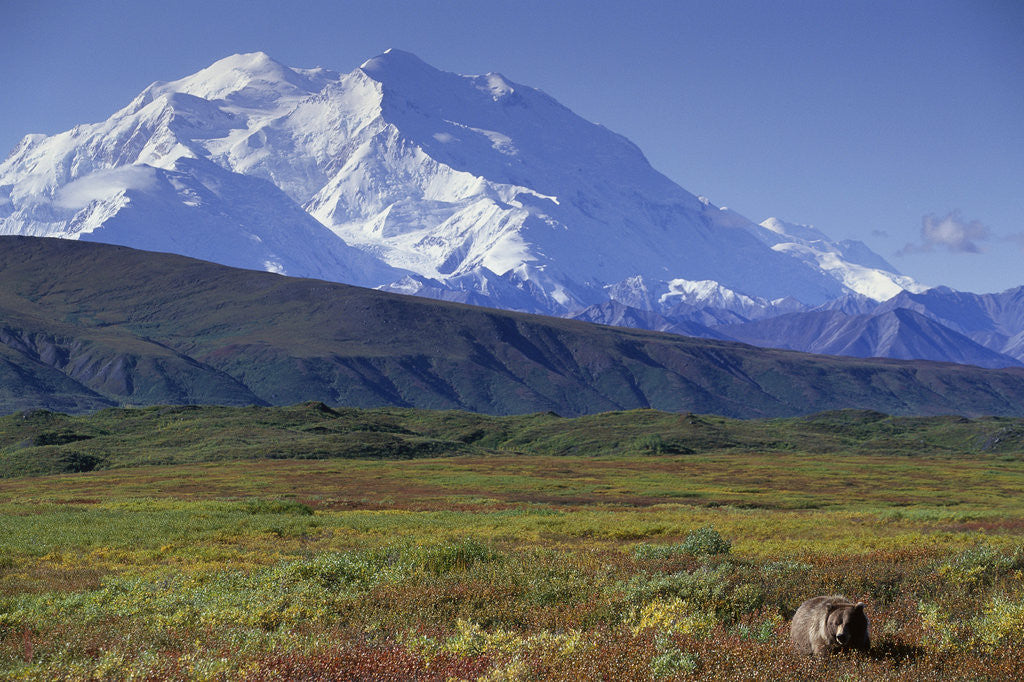 Grizzly Bear Feeding on Tundra Below Mt. McKinley