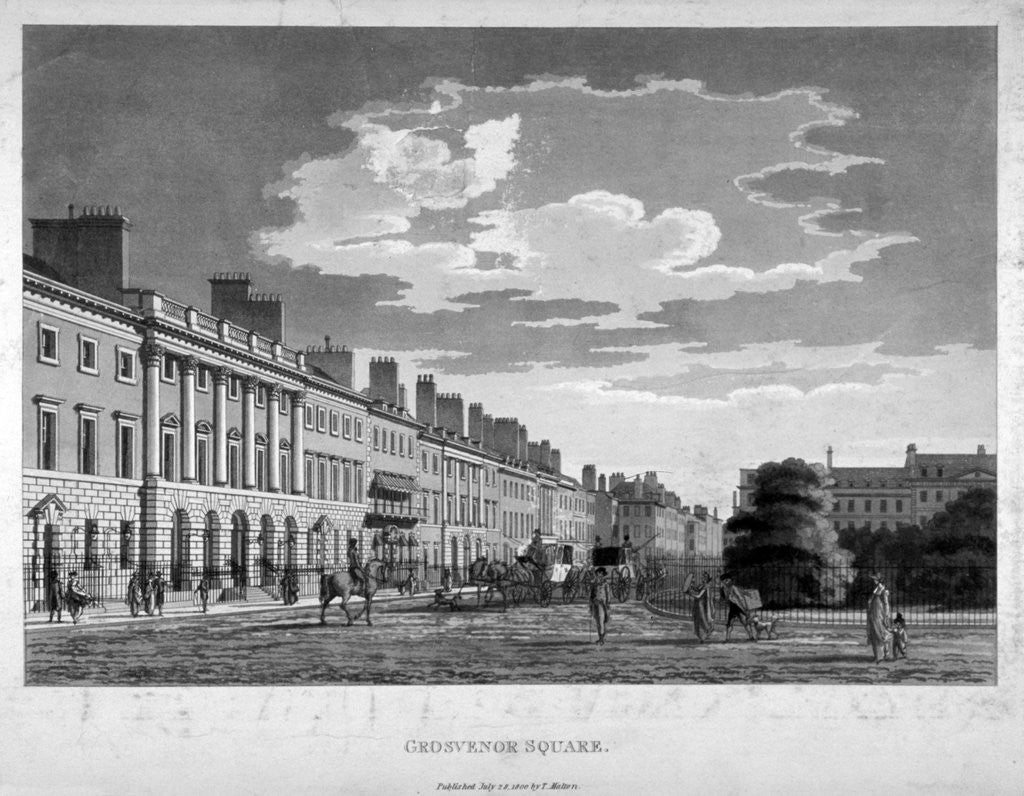 Grosvenor Square, Westminster, London, 1800. Street scene including horse-drawn carriages and figures.