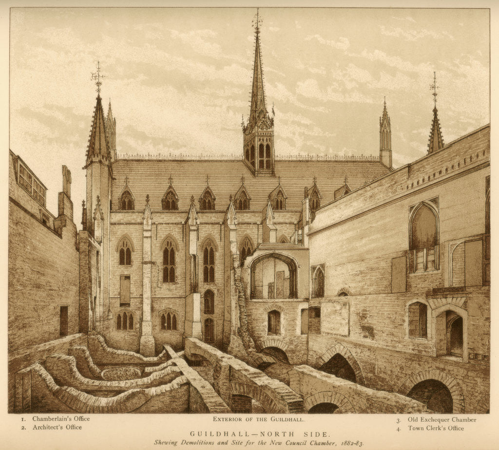 'Guildhall North Side', City of London, 1882-1883 (1886). Showing Demolitions and Site for the New Council Chamber, 1882-83. A print from Guildhall of the City of London: Its History and Associations, Corporation of the City of London, 1886.