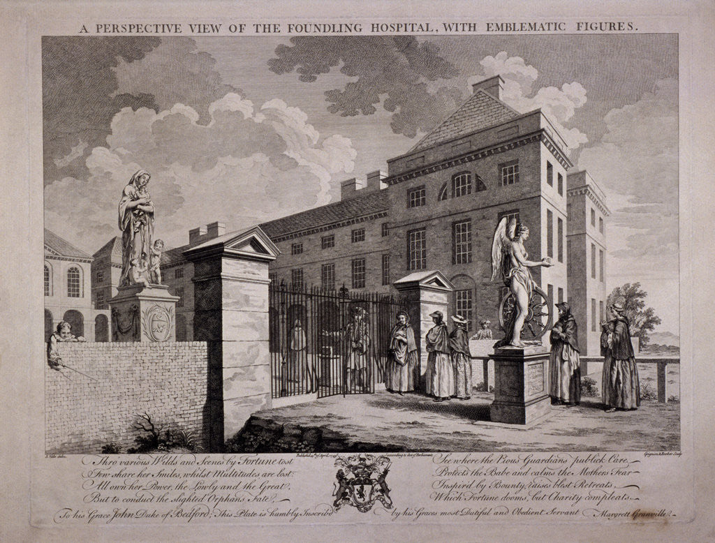 View of the Foundling Hospital, Guilford Street, St Pancras, London, 1749; with women at the gate bringing their babies to be given up.