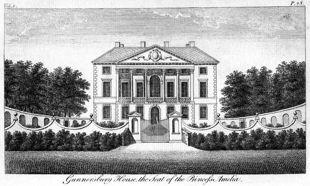 'Gunnersbury House, the Seat of Princess Amelia'. Gunnersbury House is a Palladian mansion designed in the mid 17th century by John Webb, son-in-law and pupil of Inigo Jones. It was built for Sir John Maynard, a lawyer and politician. The house was acquired in 1760 for Princess Amelia, the second daughter of King George II.