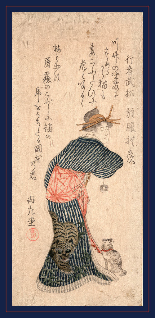 Gyoja Busho, Kubo [Between 1804 and 1818], 1 Print : Woodcut, Color ; 20.2 X 9 ., Print Shows a Woman, Wearing Kimono with a Tiger Design Identifying Her As Gyoja Busho, Holding a Toy on a String, Playing with a Cat.