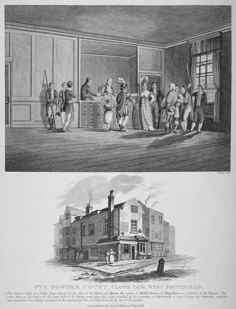 Hand and Shears Inn, Cloth Fair, City of London, 1811. Two views; above is a scene showing a case being heard at Pye Powder Court, in the dining room of Hand and Shears Inn. The judge is determining a case between two complainants regarding an injury sustained in neighbouring fair of St Bartholomew by one of the parties. Below is a vignette of the Hand and Shears' exterior with figures outside.