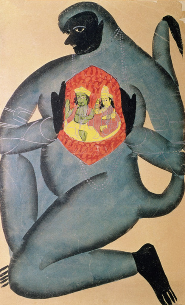 Product details Hanuman revealing Rama and Sita enshrined in his heart, painted by a member of the Patua caste, 1880