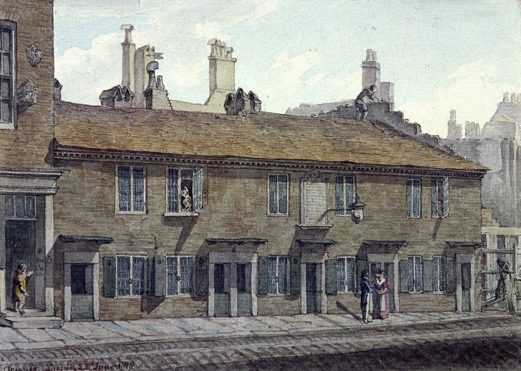 Hart Street, Cripplegate, London, 1818. View of Rogers' Almshouses which were erected on the north side of Hart Street in the early seventeenth century under a bequest made by Robert Rogers, leatherseller, in 1660. A figure is on the roof.
