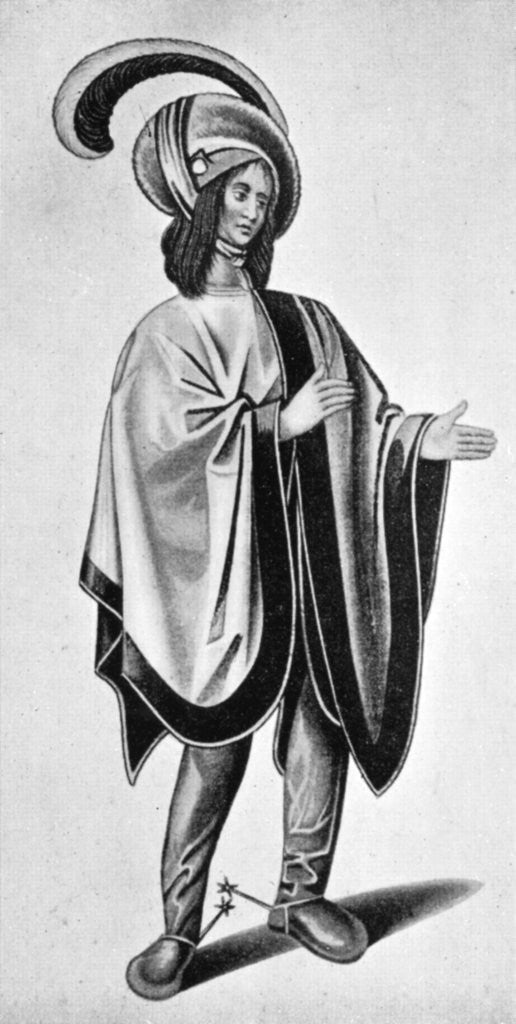 Head-gear, late 15th-early 16th century, (1910). This dandy from the time of Henry VII, (1485-1509), has tied a silk scarf over the top of his unwieldy hat to keep it in place. He is booted and spurred and wears a horseman's cloak. Illustration from British Costume during 19 Centuries by Mrs Charles H Ashdown, (London, 1910).