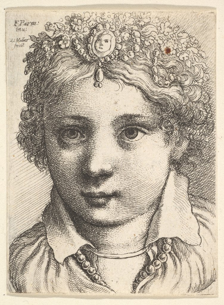 Head of a young girl wearing a jeweled headdress, ca. 1645.