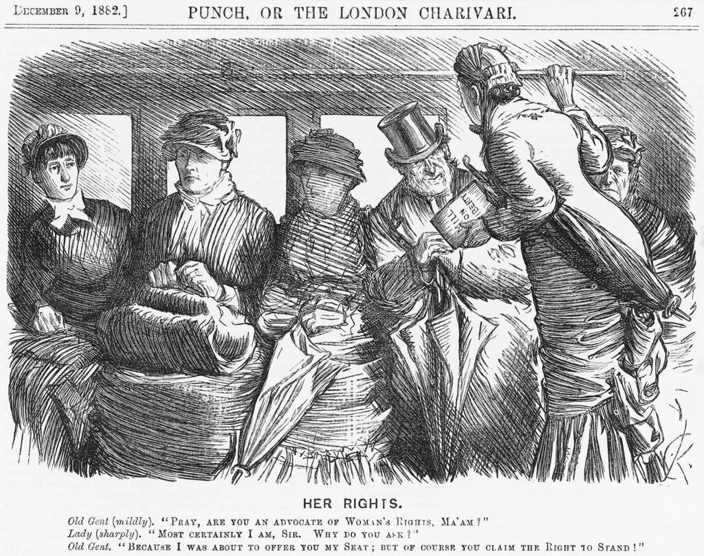 'Her Rights', 1882. Punch always enjoyed its little digs at the world of women's rights, and this cartoon shows a lady of opinion being outwitted by a comfortably seated gentleman. From Punch, or the London Charivari, December 9, 1882.