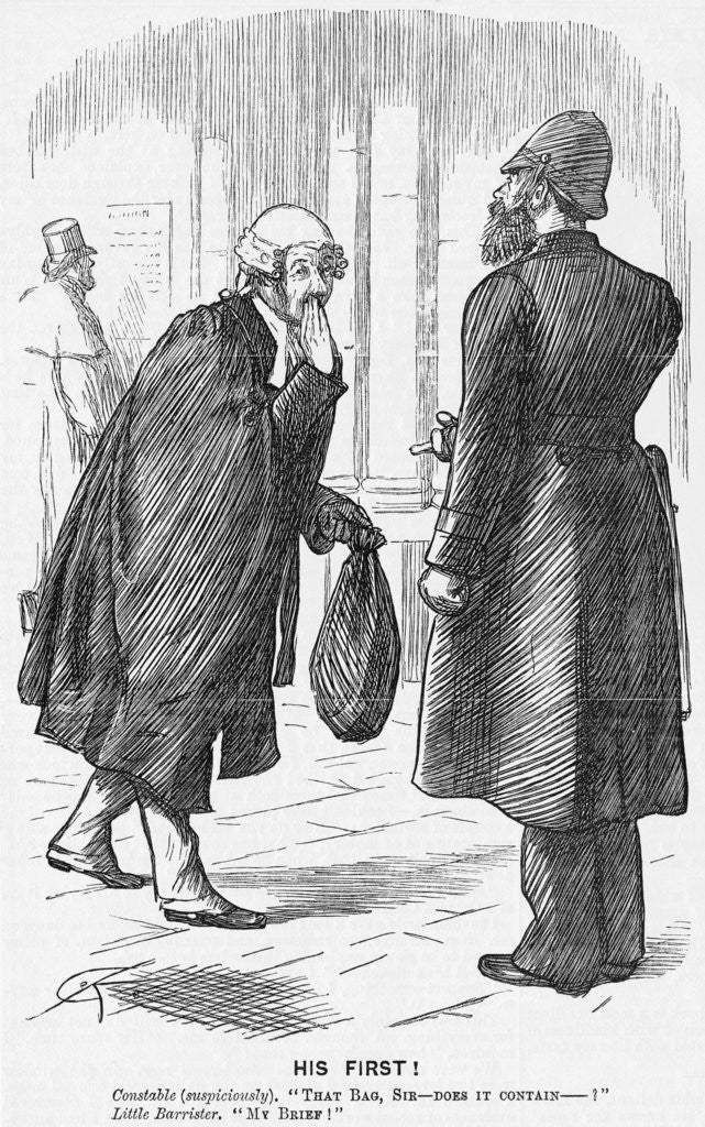 'His First!', 1885. Following Irish campaigns of violence, security at public buildings was tight and, in this cartoon, a suspicious policeman questions a barrister carrying his brief. From Punch, or the London Charivari, February 7, 1885.