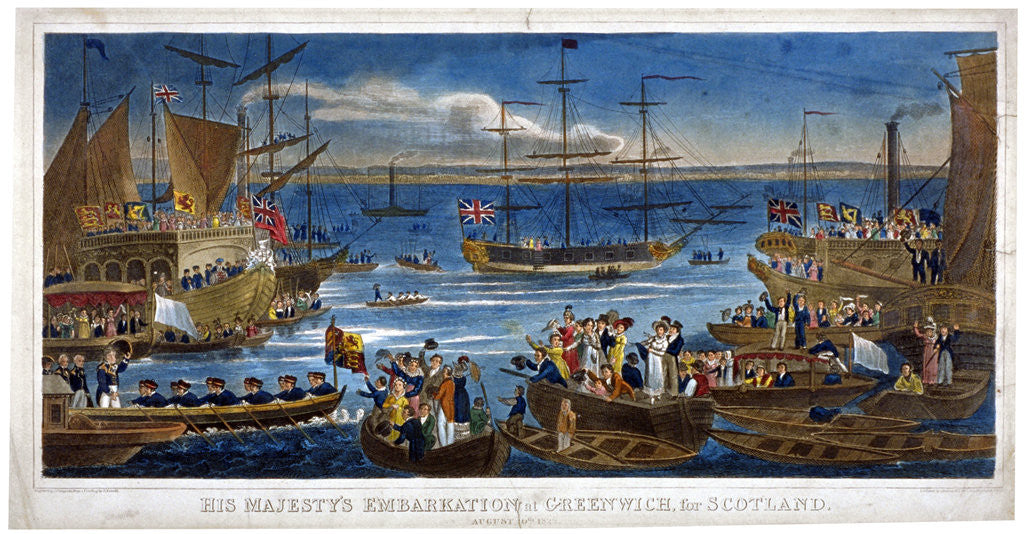 'His Majesty's Embarkation at Greenwich, for Scotland, 1822. View of George IV and his entourage embarking for Scotland on the River Thames at Greenwich. He is being waved off by figures in boats.