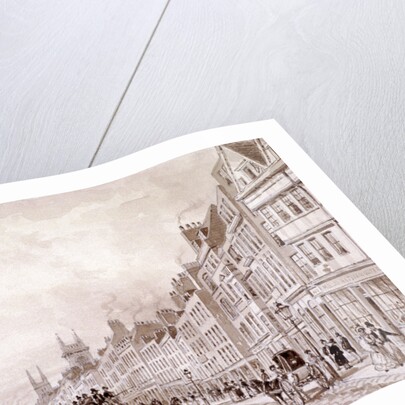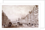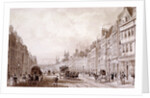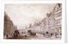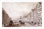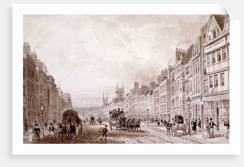 View east along Holborn, London, c1830; from the point near Gray's Inn and Staple Inn where bars had stood to mark the western extremity of the City of London; with figures, horses and carriages moving along the street.