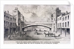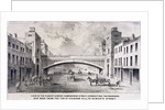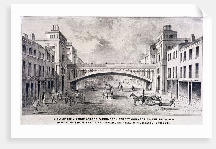 View of Holborn Viaduct off Farringdon Street, London, 1869; with St Paul's Cathedral in background; also showing traffic in street, including figures, omnibus and horses and cart loaded with barrels.