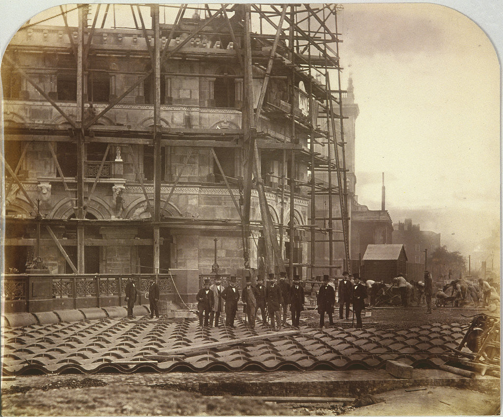 View looking west of Holborn Viaduct under construction, Holborn, London, 1869. A group of suited figures can be seen, with men labouring behind them in the background.