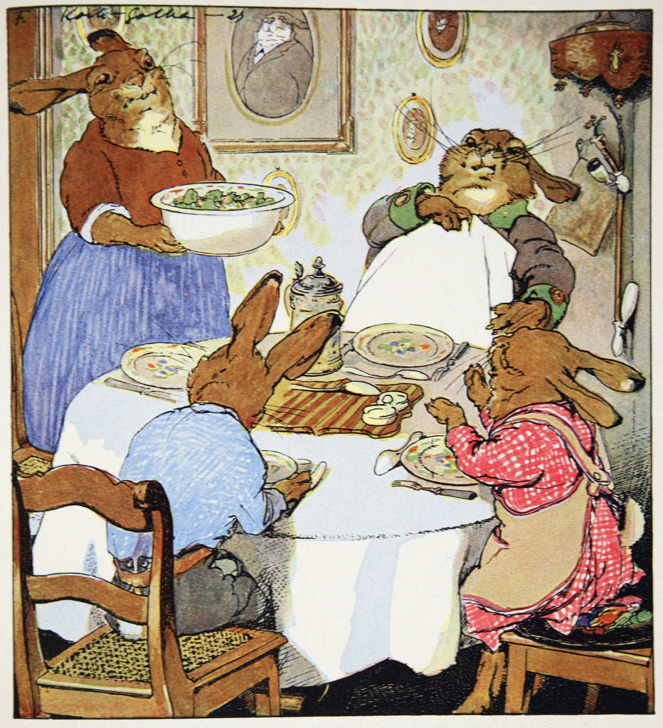 Home safe, 1924. From Die Haschenschule, ein Lustiges Bilderbuch by Fritz Koch-Gotha and Albert Sixtus, 1924. Artist's Copyright must be cleared.