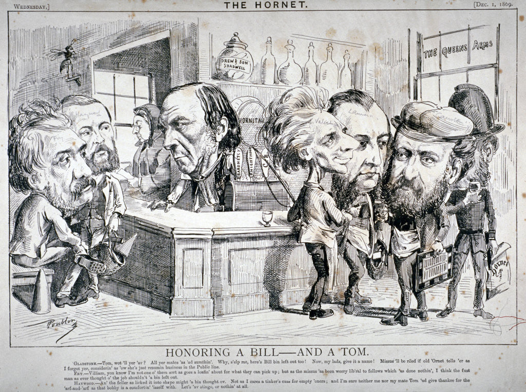 'Honouring a Bill - and a Tom', 1869. The interior of the Queen's Arms, with Queen Victoria as the landlady, Gladstone as the potman, Thomas Fry, William Haywood and Messrs Valentine, Lawrence and Causton as customers.