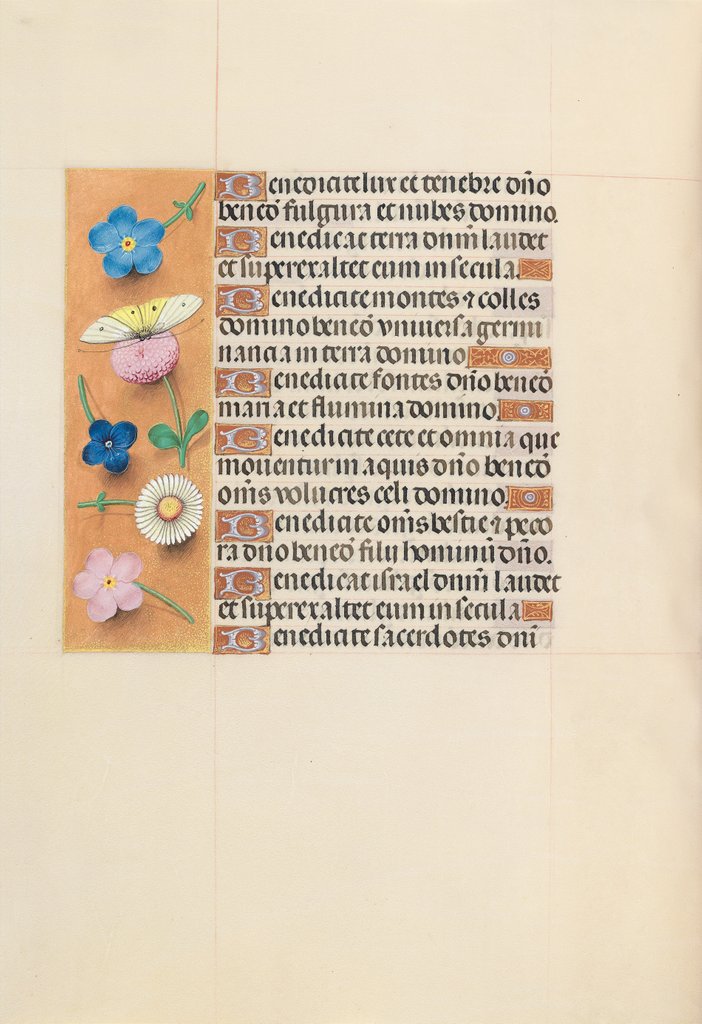 Hours of Queen Isabella the Catholic, Queen of Spain: Fol. 119v, c. 1500. This manuscript was illuminated by a circle of at least five highly organized manuscript painters active in the Flemish cities of Ghent and Bruges. The principal illuminator was Alexander Bening, who painted the majority of the book's miniatures. Manuscripts produced by this circle of artists are renowned for the decoration of their borders, which typically feature a rich variety of realistically-painted flowers, birds, and butterflies. This prayer book, called a book of hours, was intended not for a cleric, but for the private devotions of a lay person-in this case, Isabella the Catholic, Queen of Spain (1451-1504). Isabella's coat of arms embellishes the book's frontispiece. It is unlikely that the book was commissioned by the Queen herself; rather, she probably received it as a diplomatic gift from someone courting her patronage, perhaps Cardinal Francisco Jimenez de Cisneros. A Franciscan friar, Jimenez was dependent upon Isabella for his advancement, first to the post of Queen's confessor in 1492, and then to Archbishop of Toledo in 1495.