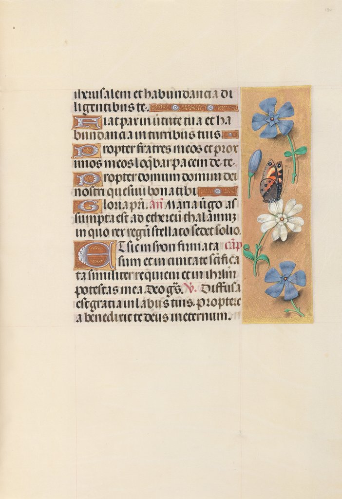 Hours of Queen Isabella the Catholic, Queen of Spain: Fol. 134r, c. 1500. This manuscript was illuminated by a circle of at least five highly organized manuscript painters active in the Flemish cities of Ghent and Bruges. The principal illuminator was Alexander Bening, who painted the majority of the book's miniatures. Manuscripts produced by this circle of artists are renowned for the decoration of their borders, which typically feature a rich variety of realistically-painted flowers, birds, and butterflies. This prayer book, called a book of hours, was intended not for a cleric, but for the private devotions of a lay person-in this case, Isabella the Catholic, Queen of Spain (1451-1504). Isabella's coat of arms embellishes the book's frontispiece. It is unlikely that the book was commissioned by the Queen herself; rather, she probably received it as a diplomatic gift from someone courting her patronage, perhaps Cardinal Francisco Jimenez de Cisneros. A Franciscan friar, Jimenez was dependent upon Isabella for his advancement, first to the post of Queen's confessor in 1492, and then to Archbishop of Toledo in 1495.