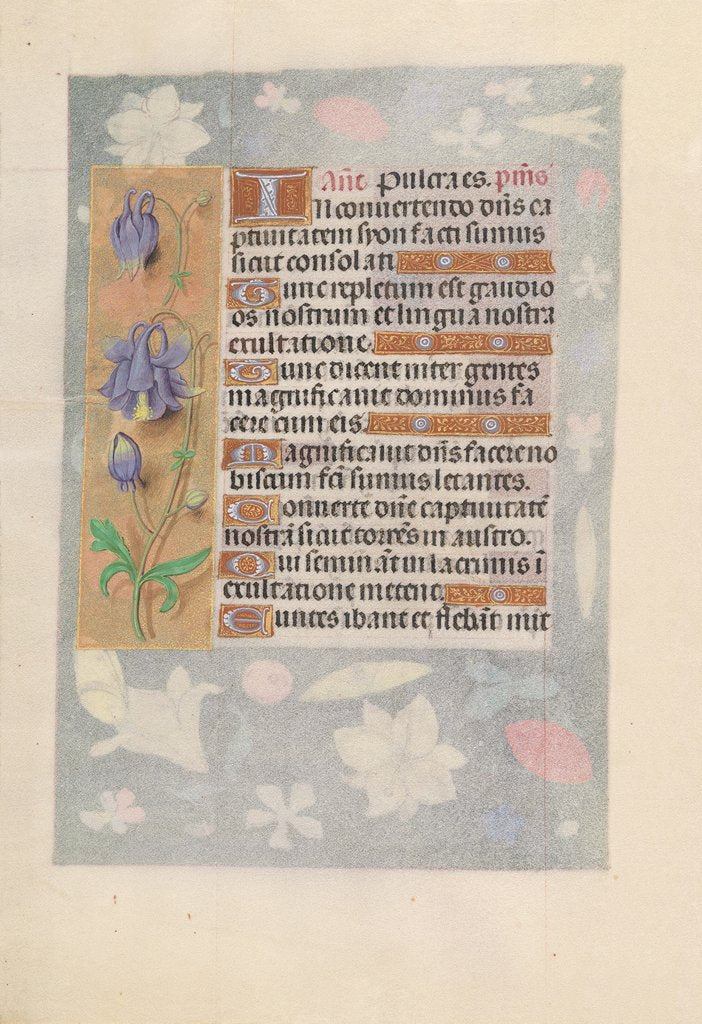 Hours of Queen Isabella the Catholic, Queen of Spain: Fol. 142v, c. 1500. This manuscript was illuminated by a circle of at least five highly organized manuscript painters active in the Flemish cities of Ghent and Bruges. The principal illuminator was Alexander Bening, who painted the majority of the book's miniatures. Manuscripts produced by this circle of artists are renowned for the decoration of their borders, which typically feature a rich variety of realistically-painted flowers, birds, and butterflies. This prayer book, called a book of hours, was intended not for a cleric, but for the private devotions of a lay person-in this case, Isabella the Catholic, Queen of Spain (1451-1504). Isabella's coat of arms embellishes the book's frontispiece. It is unlikely that the book was commissioned by the Queen herself; rather, she probably received it as a diplomatic gift from someone courting her patronage, perhaps Cardinal Francisco Jimenez de Cisneros. A Franciscan friar, Jimenez was dependent upon Isabella for his advancement, first to the post of Queen's confessor in 1492, and then to Archbishop of Toledo in 1495.