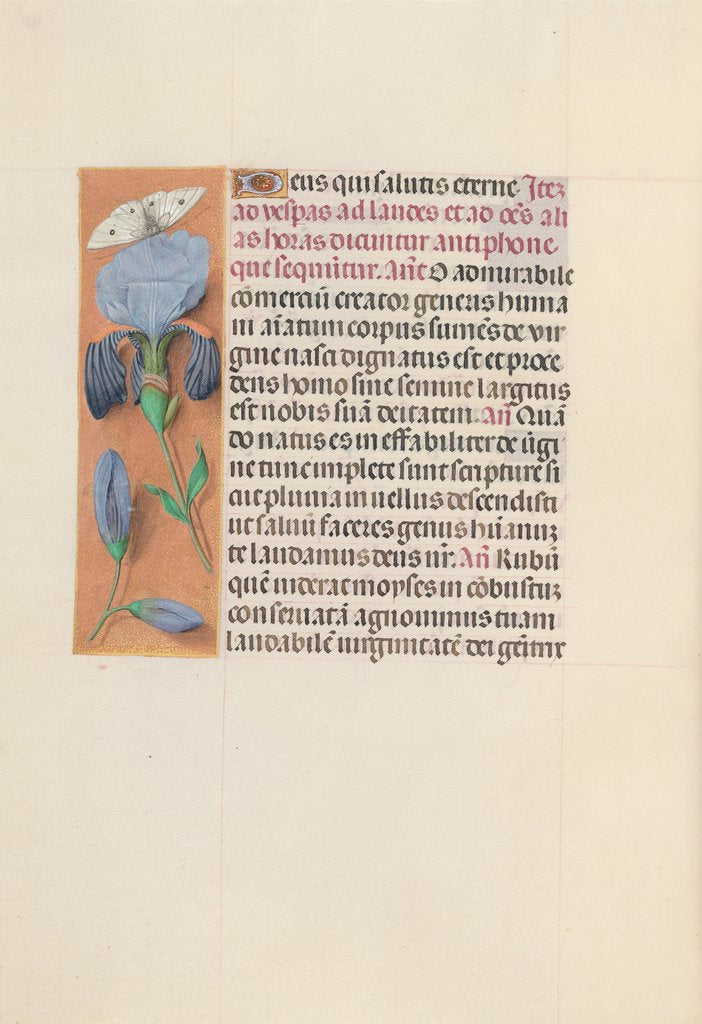 Hours of Queen Isabella the Catholic, Queen of Spain: Fol. 165v, c. 1500. This manuscript was illuminated by a circle of at least five highly organized manuscript painters active in the Flemish cities of Ghent and Bruges. The principal illuminator was Alexander Bening, who painted the majority of the book's miniatures. Manuscripts produced by this circle of artists are renowned for the decoration of their borders, which typically feature a rich variety of realistically-painted flowers, birds, and butterflies. This prayer book, called a book of hours, was intended not for a cleric, but for the private devotions of a lay person-in this case, Isabella the Catholic, Queen of Spain (1451-1504). Isabella's coat of arms embellishes the book's frontispiece. It is unlikely that the book was commissioned by the Queen herself; rather, she probably received it as a diplomatic gift from someone courting her patronage, perhaps Cardinal Francisco Jimenez de Cisneros. A Franciscan friar, Jimenez was dependent upon Isabella for his advancement, first to the post of Queen's confessor in 1492, and then to Archbishop of Toledo in 1495.