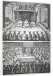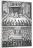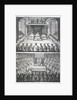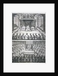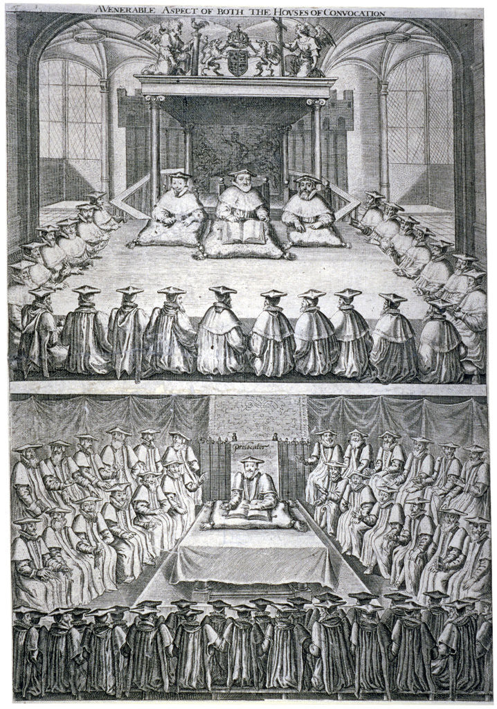 Houses of Convocation, London, c1623. Two views of the Houses of Convocation assembled in Westminster Abbey or possibly St Paul's Cathedral. The upper image depicts the upper house consisting of bishops presided over by George Abbot, Archbishop of Canterbury. The lower image shows the Lower House consisting of Deans, Archdeacons and Clerks, with John Young, Dean of Winchester, in the chair.