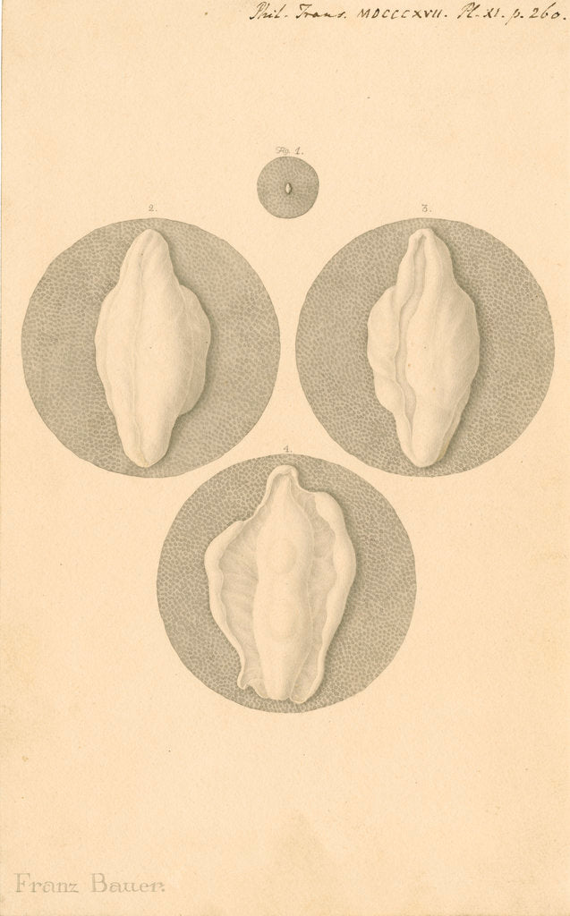 Plate 11 from the paper 'On the passage of the ovum from the ovaria to the uterus in women' by Everard Home, Philosophical Transactions of the Royal Society, vol.107 (1817), pp.252-261. Four views of the ovum including under magnification. The work is inscribed with publication and plate details. Signed lower left 'Franz Bauer.'. Inscribed verso 'Fig.1. natural size. Figs: 2. 3.4. magnified 25 times Diam: or 625 times Superficies.' Royal Society stamp verso.