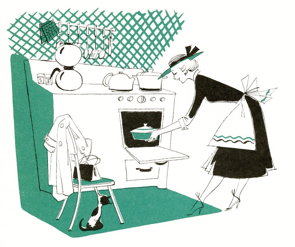 Illustration of housewife placing casserole in oven