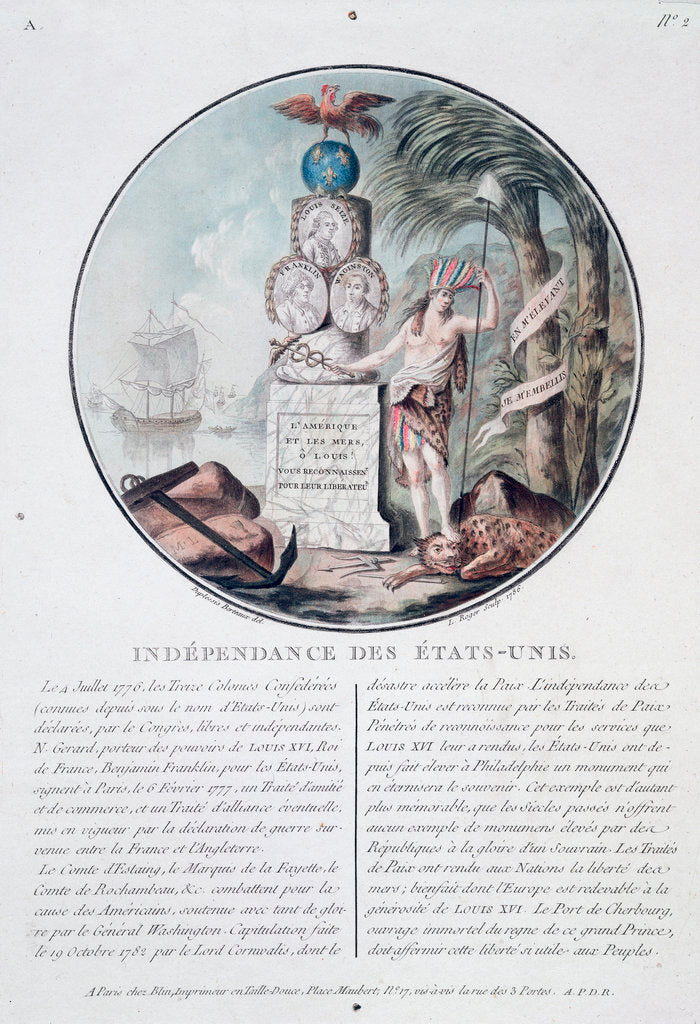 Independence of the United States, 1786. French allegory commemorating the friendship between France and the United States and the assistance given by France in support of the US gaining its independence. With portraits of Louis XVI of France, Benjamin Franklin and George Washington