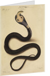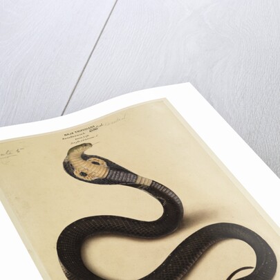Full body study of an Indian cobra ('Naja tripudians'), including variant name 'Bans-bunniah Keautiah' and details of specimen size. The reptile is noted as being drawn from life. This painting forms part of plate 3 of 'The Thanatophidia of India: being a description of the venomous snakes of the Indian peninsula, with an account of the influence of their poison on life, and a series of experiments', by Sir Joseph Fayrer FRS (1824-1907), J & A Churchill, London, 1872.