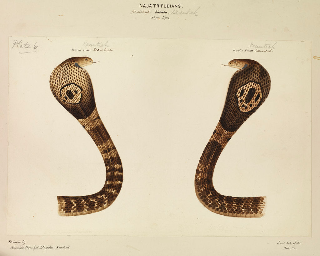 Dual study of Indian cobra heads ('Naja tripudians'), including variant names 'Macrra Keautiah' and 'Tentuliah Keautiah'. The reptiles are noted as being drawn from life. This painting forms plate 4 of 'The Thanatophidia of India: being a description of the venomous snakes of the Indian peninsula, with an account of the influence of their poison on life, and a series of experiments', by Sir Joseph Fayrer FRS (1824-1907), J & A Churchill, London, 1872.