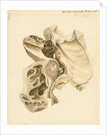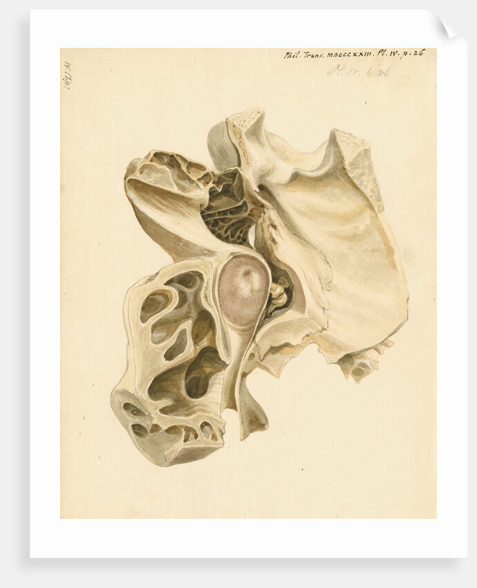 Plate 4 from the paper 'On the difference of structure between the human Membrana Tympani and that of the elephant', by Sir Everard Home, Philosophical Transactions of the Royal Society, vol.113 (1823), pp.23-26. Showing the eardrum of a three-week old Indian elephant in situ with the mastoid cells. From a specimen provided by Sir Stamford Raffles. Inscribed with publication and plate details. Signed in ink lower left [viewed in landscape format] 'W.Clift.' Royal Society stamp verso