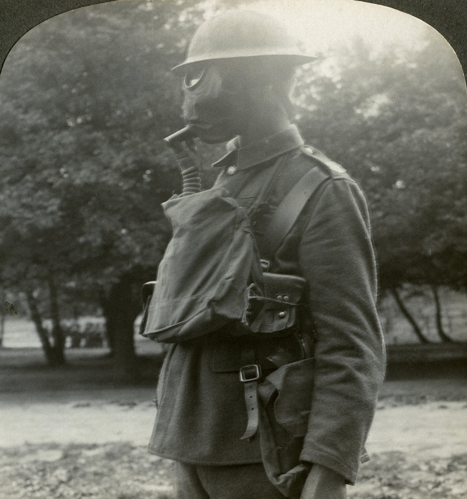 Infantry fitted with the latest gas marks and steel helmets, World War I, 1915-1918. The Germans were the first to make use of poison gas on the Western Front, at Ypres in April 1915, but by the end of the war both sides had made extensive use of gas. Stereoscopic card detail.