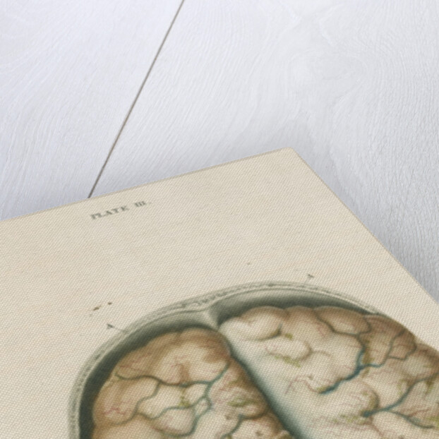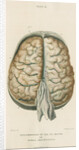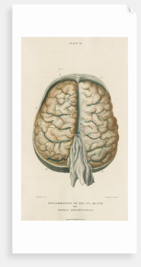 Human cranium exposed to show the brain and inflammation in two membranes of the meninges (protecting the central nervous system). Plate 3 from the monograph The morbid anatomy of the human brain; being illustrations of the most frequent and important organic diseases to which that viscus is subject, by Robert Hooper (London, Longman, Rees..., 1826). Inscribed: 'PLATE III. J.Howship, delt. J.Wedgewood sculpt. INFLAMMATION OF THE PIA MATER and TUNICA ARACHNOIDES. Published by Dr. Hooper. Jany.1826.'