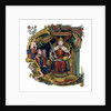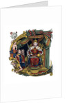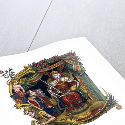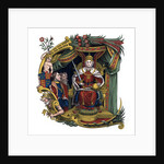 Initial letter 'C', 1563, (1843). Queen Elizabeth, attended probably by three members of her privy council. From a woodcut used by John Daye the printer, in the original edition of Foxe's Book of Martyrs, printed in 1563. Illustration from Dresses and Decorations of the Middle Ages from the Seventh to the Seventeenth Centuries, by Henry Shaw, (London, 1843).