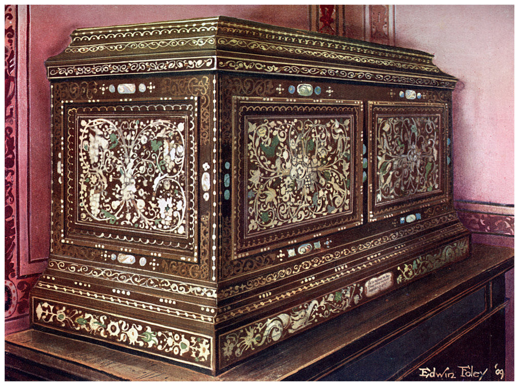 Inlaid jewel casket of walnut wood with panelled front, sides and top, 1910. A print from The Book of Decorative Furniture, Volume I, TC and EC Jack Limited, 35 Paternoster Row, and Edinburgh, 1910.
