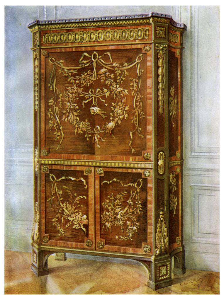 Inlaid ormolu mounted upright secretaire, French, 1911-1912. Made from sycamore, tulip, kingwood, holly and other woods natural and stained. French transitional Louis XV-XVI style, in the national collection. A print from The Book of Decorative Furniture its Form, Colour and History, Volume II by Edwin Foley, TC and EC Jack Ltd, London, 1911-1912.