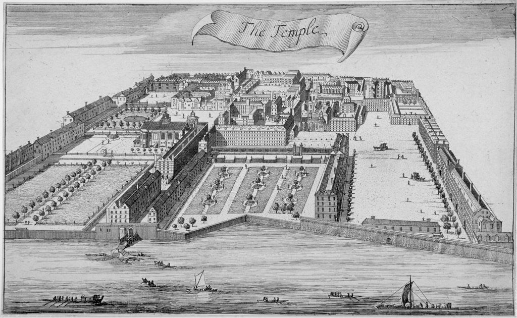 Inner and Middle Temple, City of London, 1700. Bird's eye view of Inner Temple and Middle Temple showing their proximity to the River Thames.