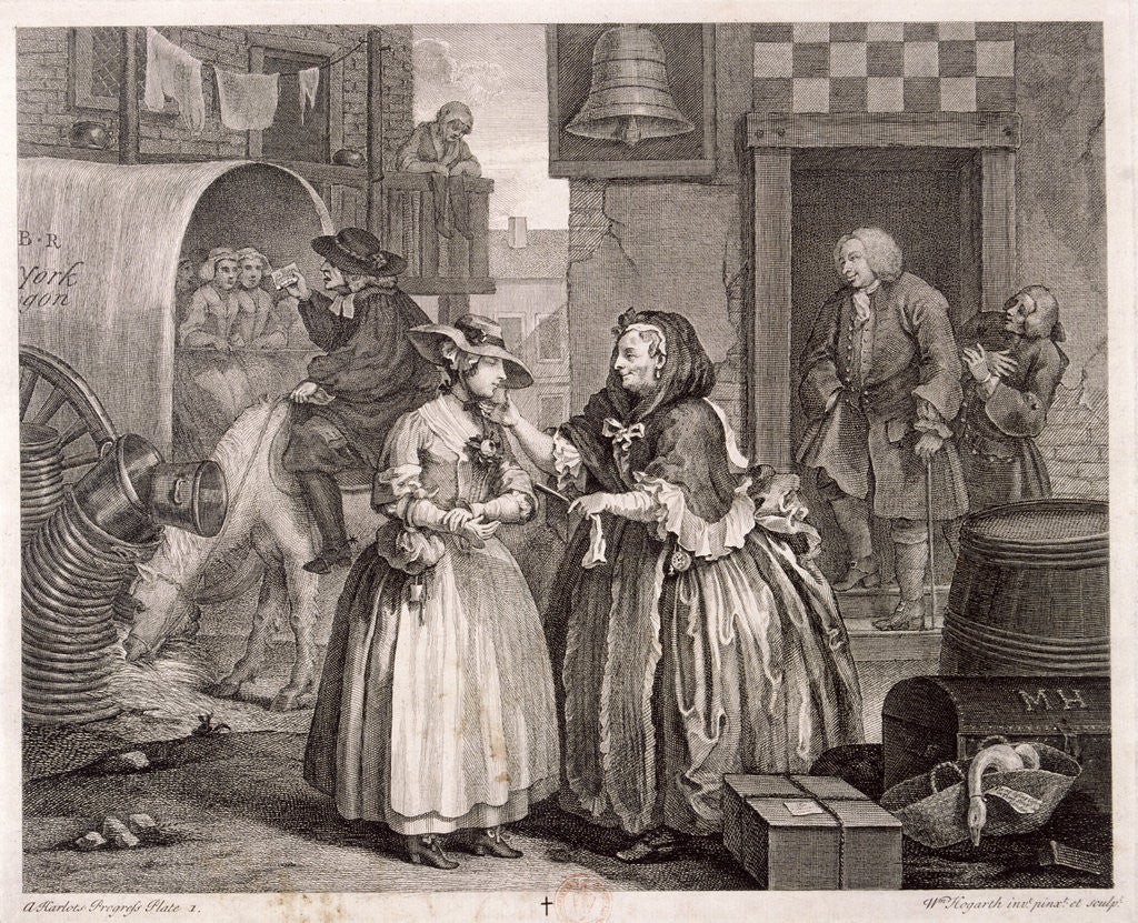 Innocence betrayed, or the journey to London, plate I of The Harlot's Progress