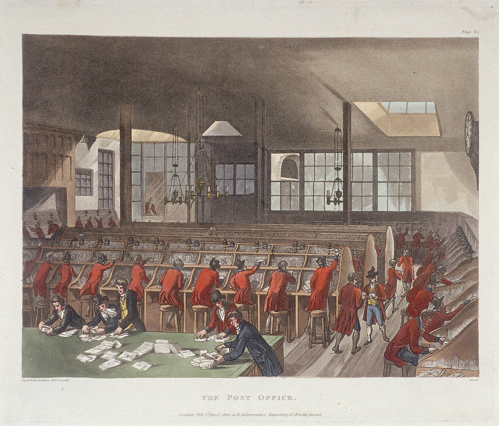 Interior view of sorting office in the General Post Office, Lombard Street, London, 1809. Shows men sitting at desks in red coats and men at a large table in green coats sorting letters.