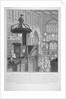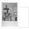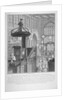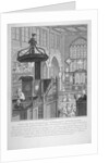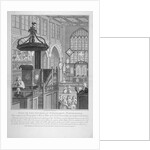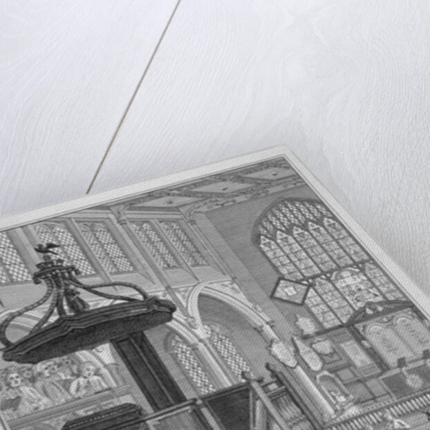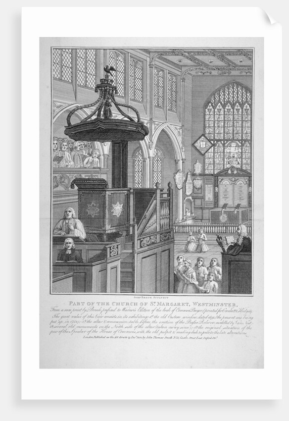 Interior of St Margaret's Church, Westminster, London, 1808. View looking east, showing figures in a service, with a descriptive text below.